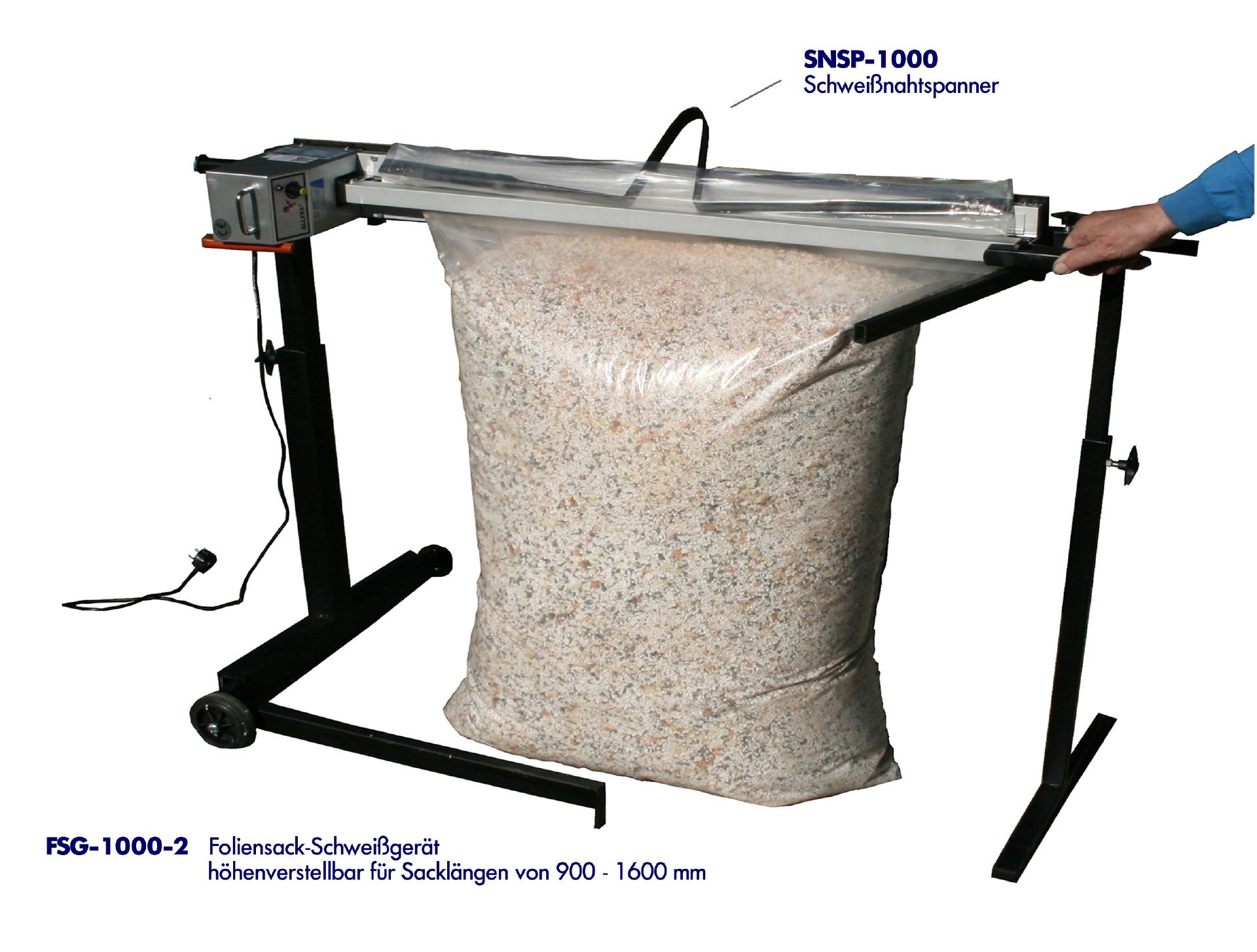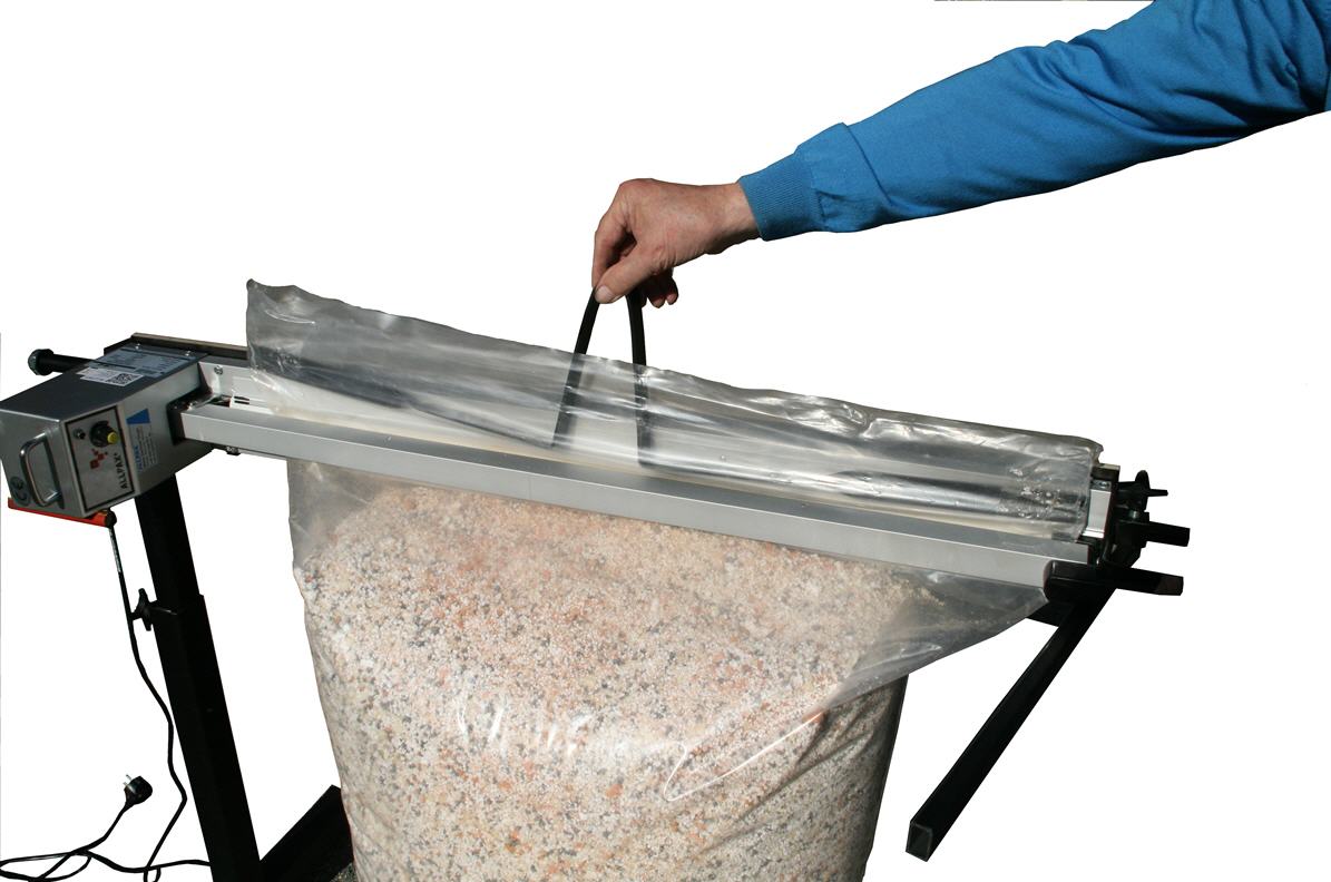 Mit dem gleichen Gerät können nach 10 Minuten Umbauzeit die gefüllten Foliensäcke faltenfrei verschlossen werden.